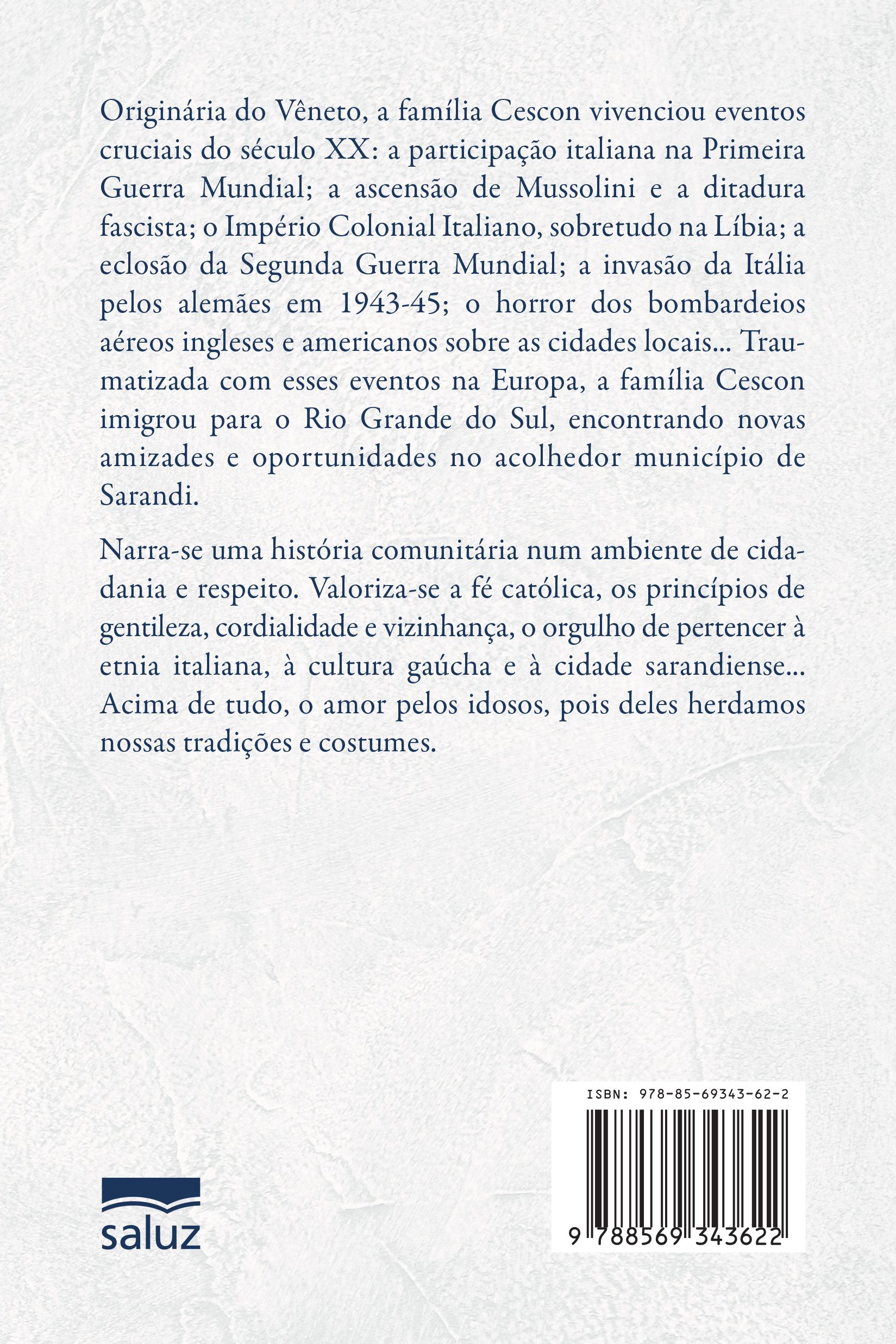 uma família católica norte-italiana – famiglia Cescon – que passou por diversas privações e que só no pós-guerra, traumatizada com os eventos, imigraria para o Rio Grande do Sul no “Novo Mundo” em busca de vida melhor.
