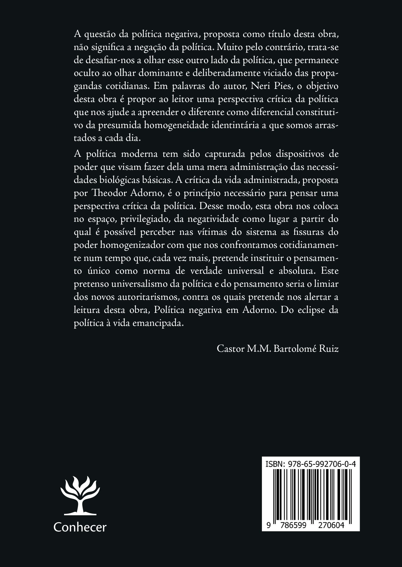 O autor busca, com apoio da grande tradição filosófica da teoria crítica – em especial Theodor W. Adorno –, construir uma reflexão profunda sobre o desaparecimento, o eclipse, daquele espaço cotidiano onde se decidiam as questões, desde as mais importantes até as mais insignificantes, acerca de nossa existência.